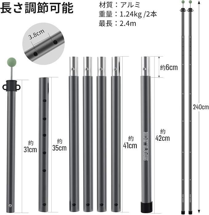 【7節分割式構造】直径25mm・厚さ1.5mm・最長240cm。分割式なので、使用後楽々に分解して保存できます。ポールの数によって、異なるタープのスタイル設営することができます。