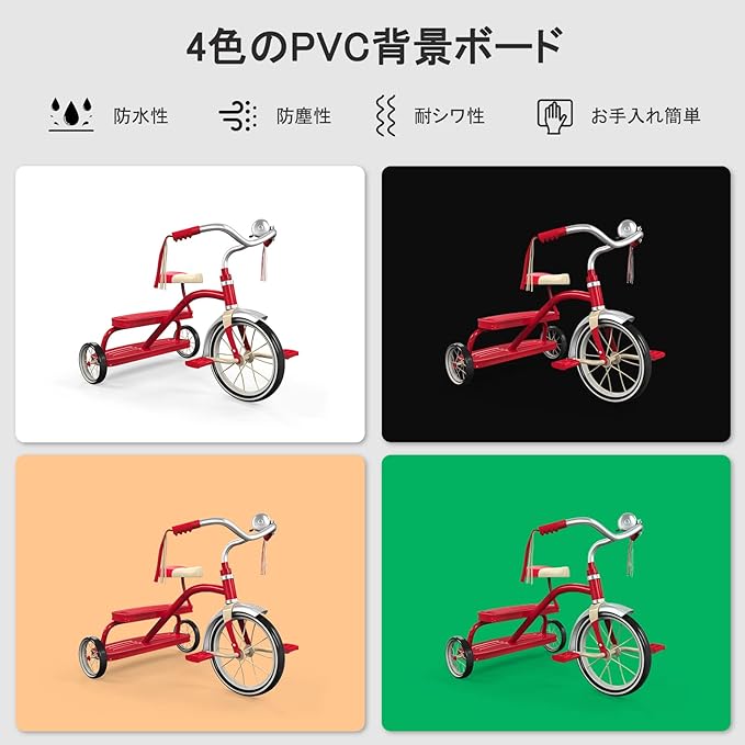 【4色のPVC背景シート】黒・白・緑・オレンジの4色PVC背景ボード付きで、被写体に合わせて自由に選択可能。透明タブが背景布をしっかり固定し、撮影中のずれ落ちを防ぎます。初心者からプロまで安定した撮影環境を実現し、ブログやオークション商品、宝飾品・工芸品、チラシ、ガンダム、メニュー撮影など幅広いシーンで活躍。背景を使わなくても素敵な効果が楽しめます。