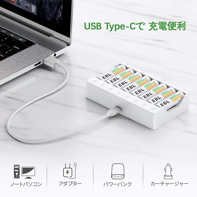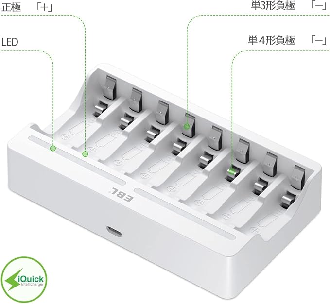 EBL 電池充電器 単3 単4 ニッケル水素/ニカド充電池に適用 USB-Cケーブル充電 電池の充電1-8本自由対応可能 電池じゅうでんき単体 ニッカド充電器