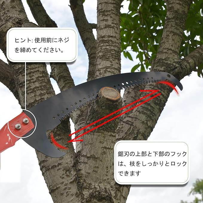 安定性:最新のアップグレード刃を使用すると、2本のネジを使用してソーヘッドリンクを固定できるため、安定性が大幅に向上し、効率が向上し、作業の安全性が向上します。 のこぎりの端にあるフックを使用すると、もろい枝を折ることができ (鋸で切る必要はありません)、木にぶら下がっている切断された枝を取り除くことができます。