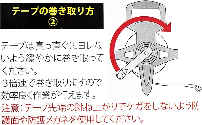 テープを勢いよく巻き取ると跳ねたり暴れる恐れがあり危険です、テープを巻き取る際はスピードを加減し調節しながら行ってください。