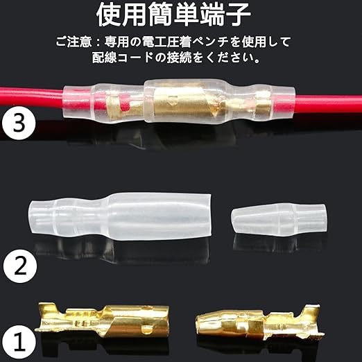 【使用簡単】まず、絶縁スリーブを電線に接続し、次にケーブルの両端にメスとオスの端子を繋げて組み合わせて使います。ご注意:専用の電工圧着ペンチを使用して配線コードの接続を行います。