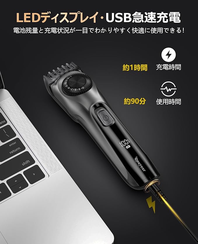 【USB急速充電&LEDディスプレイ】大容量バッテリーを内蔵し、1時間のフル充電でコードレスで90分間使用できます。LED液晶ディスプレイで、バッテリー残量、充電状況などの情報が表示され、一目でわかりやすく快適に使用できます。急速充電機能が揃え、約5分間の急速充電で髭剃り1回の電力を供給できます。忙しい朝でも素早くヒゲトリミングできます。