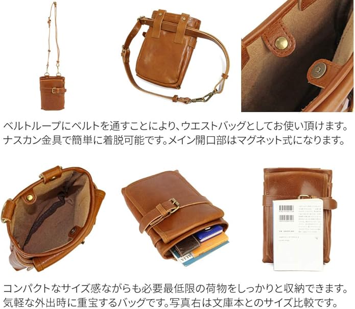 シザーケースを思わせる軽快デザイン。肉厚レザーの質感を存分に味わえるウエストバッグです。ショルダーベルトの付け方によって、腰に巻いたり、斜めがけとしても使える、2WAY仕様が嬉しい。 コンパクトなサイズ感ながら、適度なマチ幅があり、財布など必需品をしっかり収納できます。かぶせを捲くった前ポケットには、携帯等の小物も入れられて便利です。普段使いはもちろん、荷物の少ない日の通勤・通学や旅行時のセカンドバッグにも使えます。