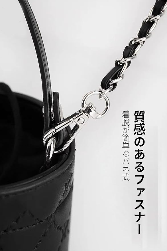 【メイン素材】合成皮革(PUレザー)のショルダーストラップ、軽量なメタルチェーンを外側に付け、バッグ全体に光沢感を与え、エッジの効いたスタイルに仕上げています。