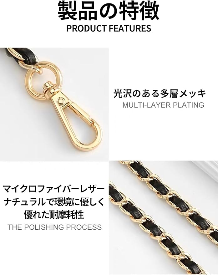 【メイン素材】合成皮革(PUレザー)のショルダーストラップ、軽量なメタルチェーンを外側に付け、バッグ全体に光沢感を与え、エッジの効いたスタイルに仕上げています。 【多くのスタイル】豊富なカラーバリエーションとデザイン(フルチェーンタイプと一部レザーショルダーストラップ付き)からお選びいただけます。 【高品質なPUレザー】プレミアムPUレザーと頑丈な合金製バックルを使用し、本革に近い柔らかさ、質感、感触を持ちながら、より耐久性の高いストラップです。 折れたり、変形したり、剥がれたりしにくく、何年も使える。ショルダー 紐べて非常に軽く。肩に掛けても重くない軽量な 、で長時間のご使用にもおすすめです。 【理想的な代替品】両端に2つの回転バックルが付いており、簡単に取り付け、使用することができます。 バックルを留めるだけで、縫い目のない新品のバッグが完成します。高品質と絶妙な革のバッグ用ショルダーベルトはあなたのバッグ、理想的な交換によく合い。 【幅広く使用】フックできるリングがあるバッグであれば、お手持ちのバッグに取り付けることができます。財布、クラッチバッグ、ハンドバッグ、ショルダーバッグ、アンダーアームバッグ、クロスボディバッグ、ラップトップバッグ。*に注意:お客様の端末環境、画面設定により、実際の商品と色が異なって見える場合がございます。