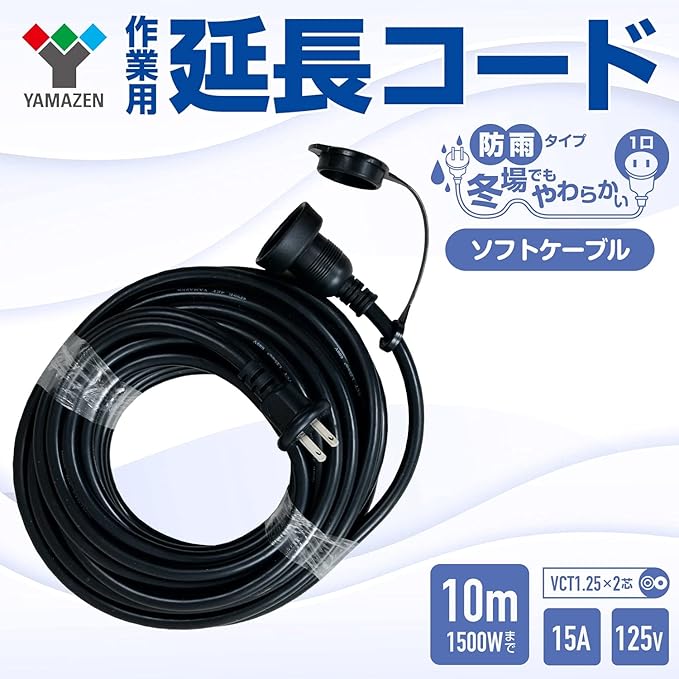 山善(YAMAZEN) 延長コード 10m 1口 15A 125V 1500W 防雨型 ブラック 防水 ソフトケーブル 延長ケーブル 延長コンセント OAタップ 電源コード 電源タップ コードリール ECW-S1510
