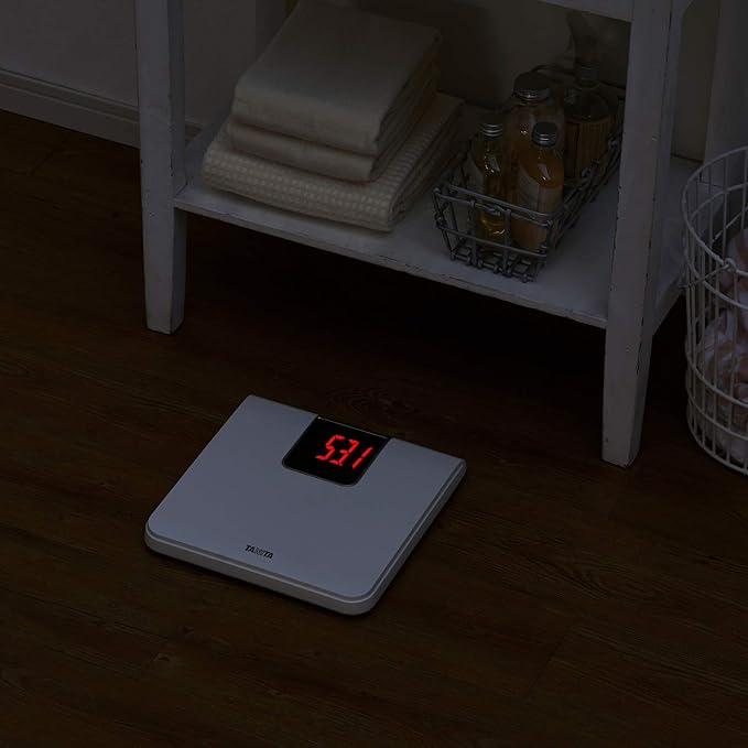 すっきりと洗練されたシンプルなデザイン。暗いところでも見やすい赤色LED表示で、乗るだけで電源が入る便利な機能がついています。