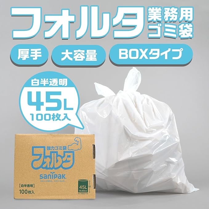 【商品詳細】容量:45L 袋のサイズ:横幅65cm 高さ80cm 厚さ:0.030mm 枚数:100枚 色:白半透明 材質:ポリエチレン(低密度ポリエチレン)原産国:インドネシア※注意点:多くの枚数でありながらもゴミ袋を小さく折りたたむことでコンパクトさを実現しています。最初は取り出しづらい可能性があります。