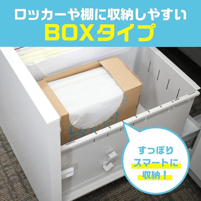 【収納しやすい】収納場所を取りたくないというニーズにお応えし、通常の1/2コンパクト包装でBOX型にしました。1枚ずつ取り出しやすく、コンパクトに収納できるBOX型パッケージは、キッチン引き出しやオフィス・収納棚等へ収納しやすく場所取らず便利です。