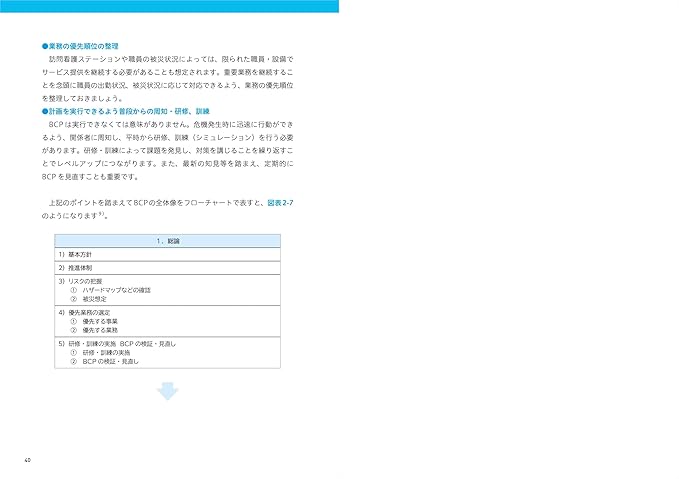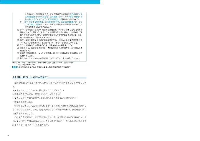 BCPの策定は、単に書類を整えるだけではありません。災害時においては、限られた人的資源、物品などを用いて、サービス提供の優先順を的確に捉え、従業員の安全を確保しつつ、継続して利用者に必要なサービスを提供する必要があります。本書では、訪問看護ステーションの現場で活用できるよう、実際の状況を想定した実践的なアプローチと手順を分かりやすく解説しています。また携帯に便利なBCPカードのサンプルも用意しました。
