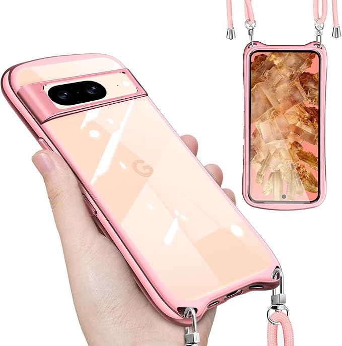 Google Pixel 8 ケース クリア ショルダー ストラップ付き グーグル ピクセル8 カバー 透明 肩掛け 縄掛け 斜めかけ TPU メッキ加工 耐衝撃 全面保護 薄型 韓国 可愛い Pixel 8 スマホケース (ローズゴールド) | etshop