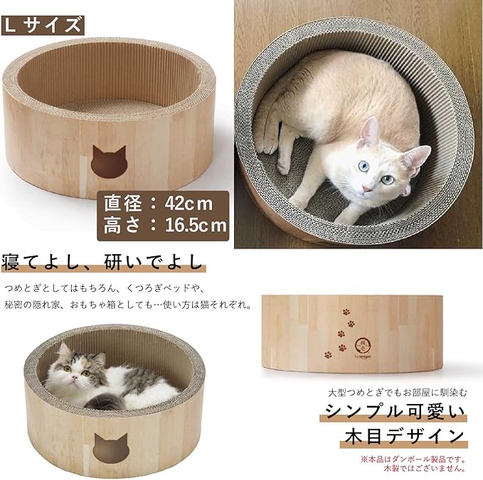 バリバリサークルLは、名前の通り猫がまんまるく丸まってくつろげる円形ベッドです。段ボール製なので、つめとぎとしての使用も可能。内側スペースを直径42cmの広め設計なので、猫がまんまるく丸まった時に窮屈すぎず、広すぎず、絶妙なフィット感です。高さ16.5cmで隠れ家感も演出