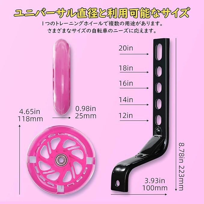 ユニバーサル直径と利用可能なサイズ:一部の自転車補助輪は1つまたは2つのサイズの自転車にしか適合しないという事実にまだ悩まされていますか? もうその心配は要りません。5つのさまざまな穴が取り付けられたブラケット付きの補助輪(直径:118mm)は、12/14/16/18/20インチのサイズの自転車に取り付けるためのニーズに最適です。その丸い姿と美しい外観は、ロリポップのように互いに完全に一致し、子供たちに色彩豊かな子供時代をもたらします。(注:可変速自転車では使うことはできません。)