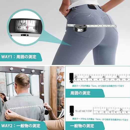 【使い方②:周囲の測定】巻き尺は物体の外周や体のサイズなどを測るのに使えます。また、巻き尺のもう一つの片側は「5cm」から始まりの目盛です。メジャー本体のカーブ部分を含んでいるので、計算しなくても正しい測定結果を得られます。