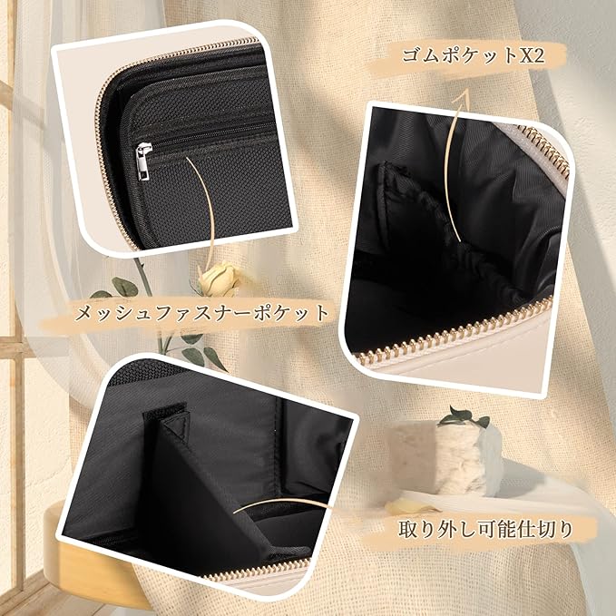 HD鏡付き:トップジッパーデザイン、蓋側にミラー付き、バッグ内側にブラシ用ポケット、スリップポケット付き。カバー付きのブラシ入れや内ポケット、リップポケットなどが付いているので大容量で収納にも困らず整理もラクラク♪普段使いはもちろん旅行などでも大活躍のアイテムです!