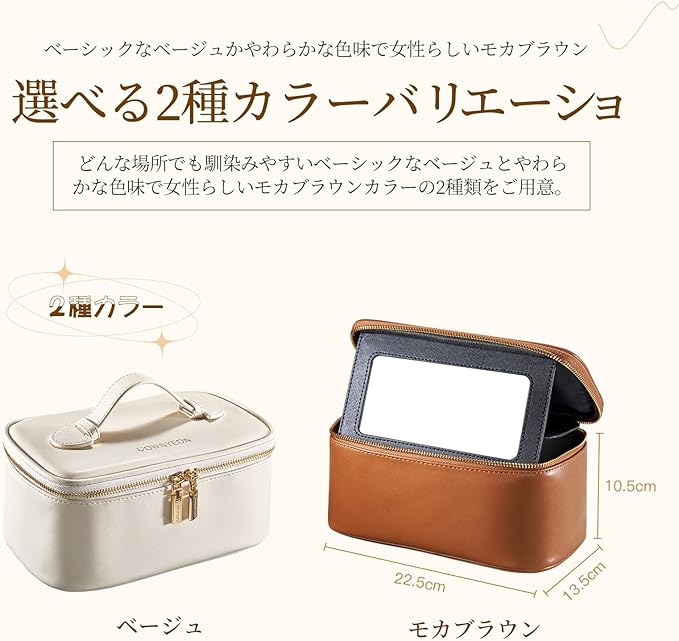 【新登場】メイクポーチはベージュとブラウンという2つの登場した。アップグレードで、ミラーが内蔵されているので、これひとつでメークが完結!鏡を見ながらメイクができます。これで、出張や旅行などの持ち運びの場合、更に便利となる。