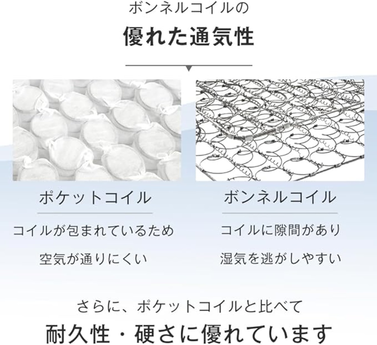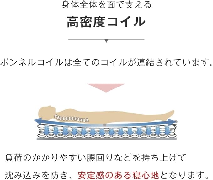 【スタッフおすすめポイント!】・身体を面で支え、硬めの寝心地のボンネルコイルマットレス・一人暮らしや小柄な女性にぴったりのセミシングルサイズ ・片面仕様にすることで、お手入れも簡単に・コイルを外側から守るヘム加工・有害なホルムアルデヒドを一切含まない、ノンホルムアルデヒド・圧縮梱包だから、搬入もラクラク!