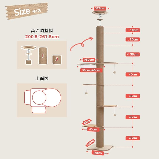 PAWZ Road キャットタワー 突っ張り 木製 全面麻紐 爪研ぎ 直径10.5cm 極太 スリム 大型猫用 猫タワー 木目調 夏 木登りタワー おしゃれ 多頭飼い クリアボウル 宇宙船付き 滑り止めマット おもちゃ 登りやすい インテリア 安定 運動不足解消 - ベージュ 高さ調整幅200.5-261.5cm | etshop