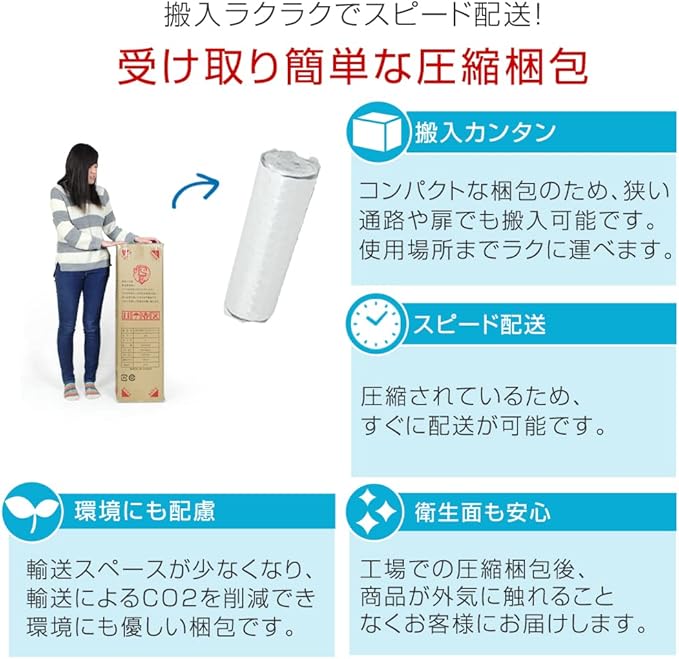【中国製】※マットレスは柔らかい素材で作られてますので、保存期間中の置き方や運搬の仕方、また測り方によって多少サイズに誤差が生じる場合がございます。予めご了承下さい。※ウレタンを使用しているマットレスは、直射日光や蛍光灯の影響によって変色することがあります。 これはウレタンの特性であり、品質や使用上の性能には問題ありません。