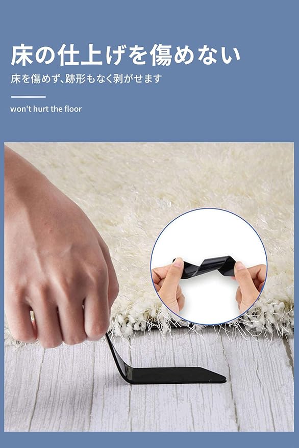 【跡が残らない】 高品質のポリウレタン素材を使用しているため、シートを剥がした際に跡が残らず、カーペットの動きを助けます。日常のちょっとしたトラブルを改善します。