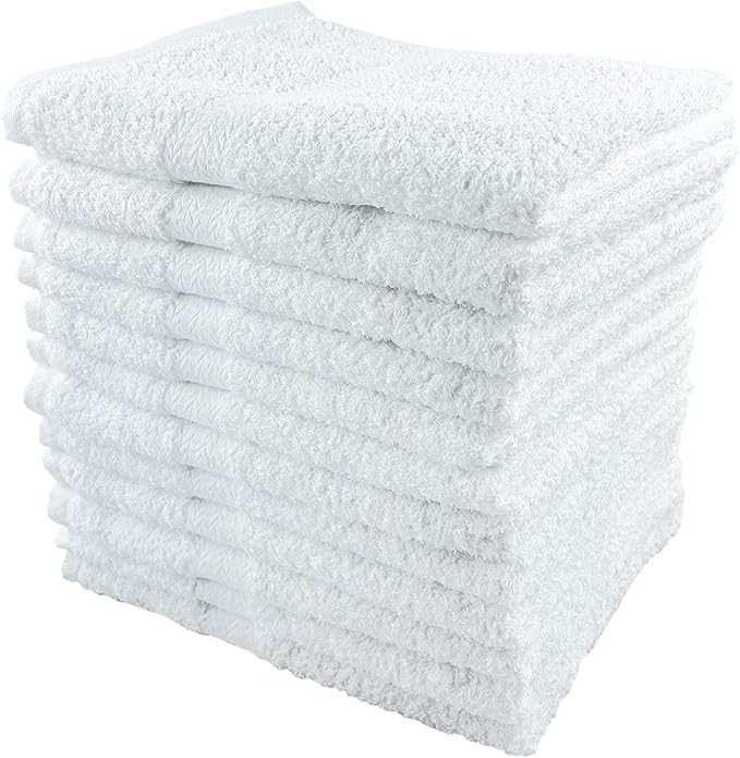 まとめ買いに便利な12枚パック。洗顔や入浴用にも掃除用にも使える万能なコットン100%の普通の白タオルです。