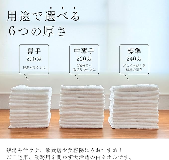 【商品サイズ・重さ(1枚当たり)】<200匁>34 82cm 約62.5g <220匁>34 85cm 約68.5g <240匁>34 85cm 約75g <260匁>34 92cm 約81g <280匁>34 100cm 約90g <300匁>34 100cm 約96g 【カラー】白 【素材】綿100% 【生産地】日本(泉州)