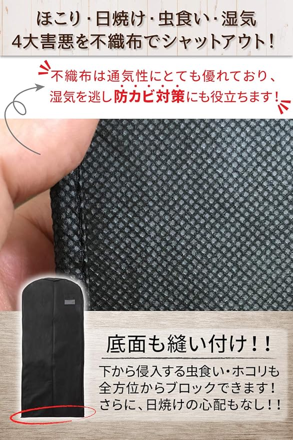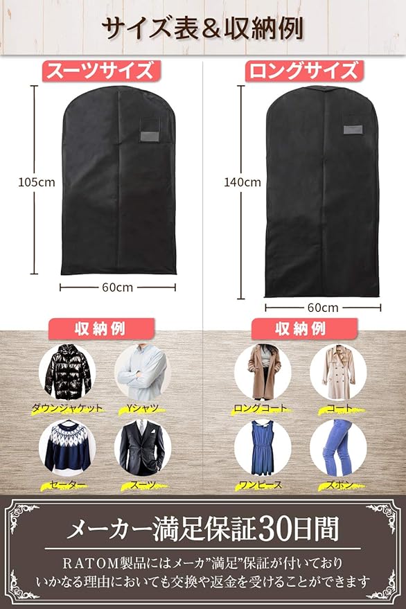 【虫・ホコリを全方位ブロック】衣類の天敵である、虫食い・ほこり・日焼け・湿気の”4大害悪”を全方位からブロックします。類似品の多くは衣類カバーの下部がオープンの状態になっています。RATOM製品は、底面も縫い付けをして、下から侵入するホコリや害虫をブロックできます。衣類カバーに洋服を収納するだけで4大害悪から洋服を守ることができます。