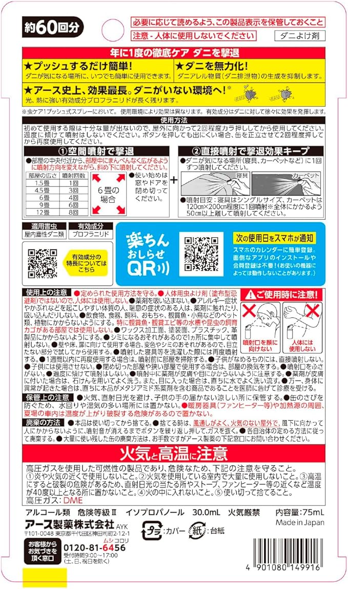 ●ダニが気になる場所(寝具、カーペットなど)に1回ずつ噴射してください。