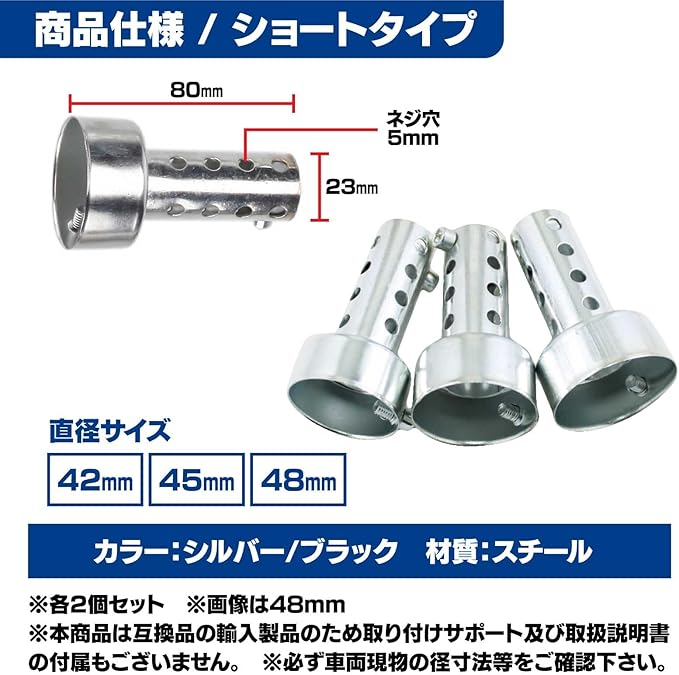 ✅【外径】ロングタイプ(カラー共通):全長約140mm 挿入部外径25mm。取付部外径35/42/45/48/60mm。ショートタイプはシルバーのみ取付部外径42/45/48mm。※車両現物に合わせた取り付けが必要です。必ず車両現物をご確認の上、不安な場合はご購入の前に専門業者にご相談ください。