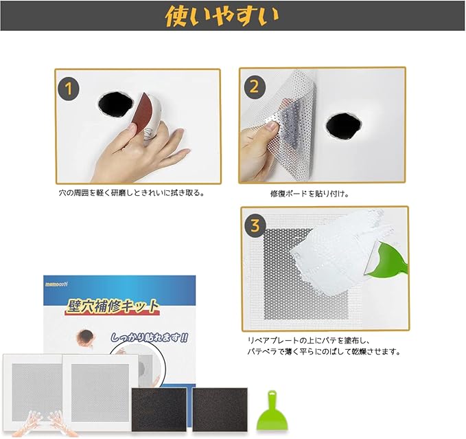 【かんたん修理】①穴の周囲を軽く研磨しときれいに拭き取る。②修復ボードを貼り付け。③リペアプレートの上にパテを塗布し、パテベラで薄く平らにのばして乾燥させます。