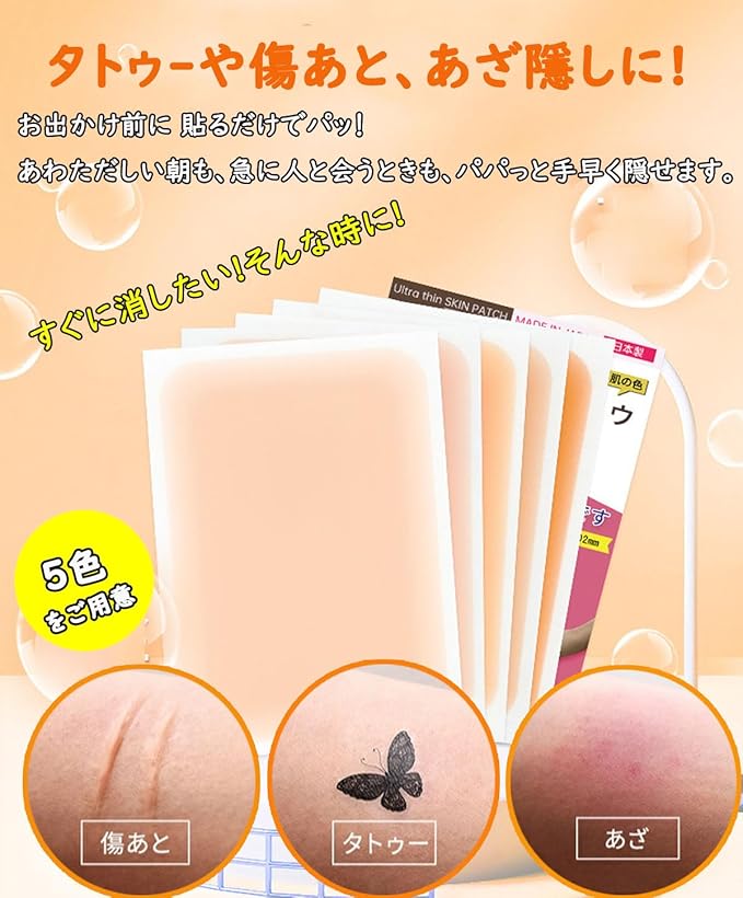 【使用性が広い】旅行、レジャー、ジム、プール、温泉などタトゥーやあざ、ほくろ、傷あとを簡単に隠せます。5~7日貼り替え不要。肌色に合わせて選べる5色、ピッタリの色が見つかる!