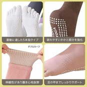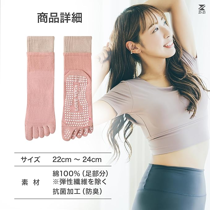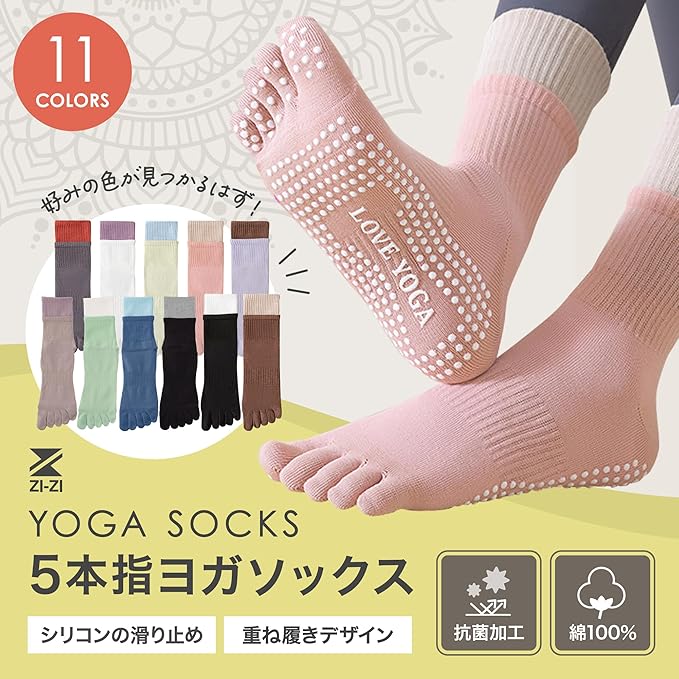 ■【新商品】通気性 抗菌・防臭!オシャレなヨガソックス ダブルカーフでずれ落ちしにくくツートンカラーでおしゃれ室内(フローリングなど)でのヨガ中、足裏に汗をかくととても滑りやすく危険です。ZI-ZIの5本指滑り止めヨガソックスは、強力な滑り止めにより転倒などの事故を防ぎ、足元を安定させることでヨガに集中できる便利なアイテム。汗を吸収し蒸れにくいので、気になる臭い対策にもバッチリ・ライクラ(LYCRA)素材使用で伸縮性抜群 ◎2色使いがオシャレなデザインなので、お気に入りのウェアとのコーディネートをお楽しみください。※抗菌防臭加工