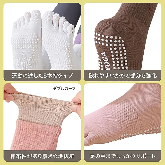 【足裏の強力グリップ】指先までカバーした足裏全面にあるシリコンの滑り止めと5本指は、安定性があり床をしっかりふんばることができるため、様々な動きのパフォーマンスアップにつながります。ヨガ・ピラティス・フィットネス ランニングなどの動きを妨げず、より快適にお楽しみいただけます。