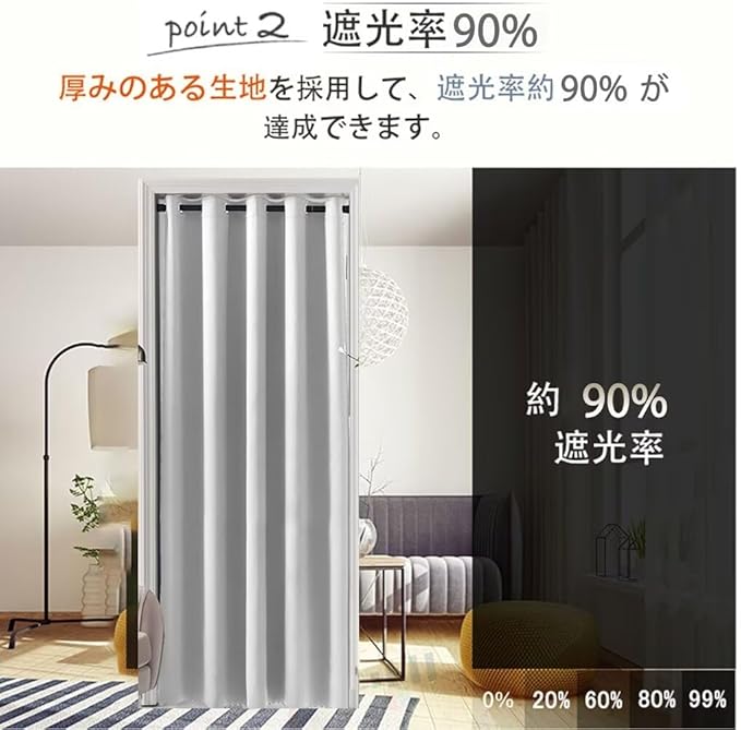 【サイズ】 :幅100cm*丈180cm「幅50cm-66cm範囲の設置場所に適応しております」 【素材】:ポリエステル+プラスチック(ハトメ部分) 伸縮性がある素材を採用し、シワになりにくい。ちょうどいい厚さ自然に垂れ、形状安定効果あり。
