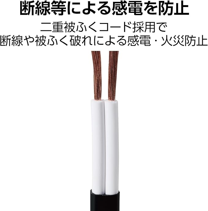 電源コードには一般社団法人日本配線システム工業会規格(JWDS0010)に適合した二重被ふくコードを採用しており、断線や被ふく破れによる感電・火災の防止に有効です。