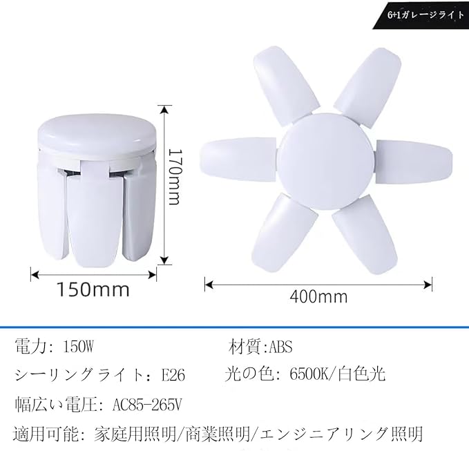 ガレージ 照明 150W ガレージライト led:7灯式の高輝度LEDパネル、合計156個の高輝度LEDランプビーズを備えている。LED 照明器具を使用し、80%の省エネ、環境に優しく、費用効果が高い。ガレージライトは、作業時に6000ルーメンを出力します。口金:E26 定格電圧:AC85-265V 定格電流:500mA/1000mA 消費電力:150W ルーメン:9500lm ライト色:昼白色 演色性:>80