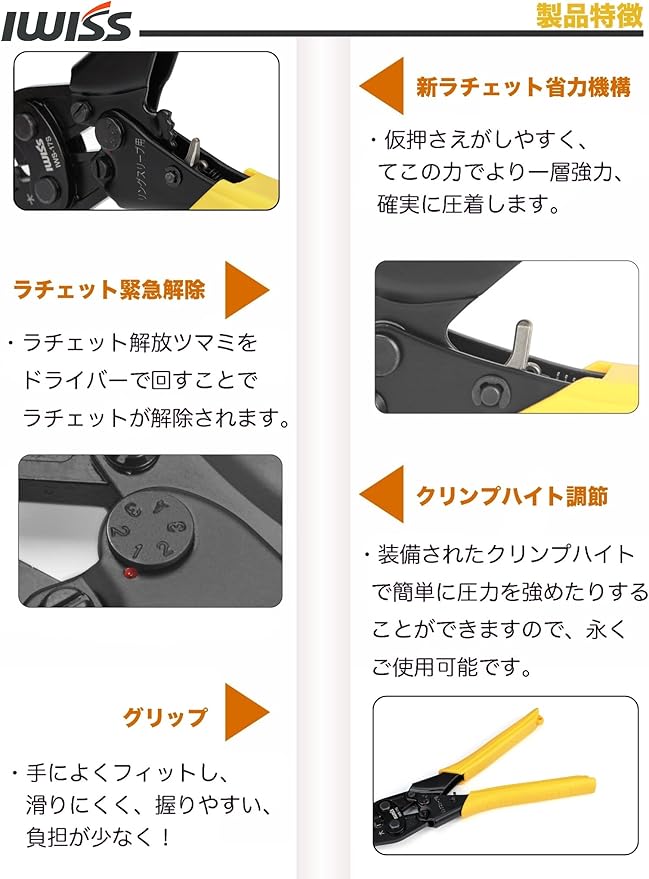※新品の場合、圧着工具(新品)のハンドル動作(リングやピン)がかたいことは正常です。しばらくお使いいただくことで少しずつなじみ、軽くなります。
