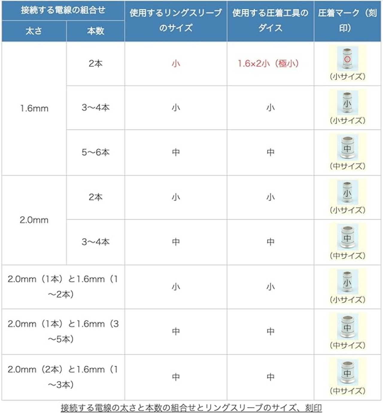 圧着ダイス(4サイズ):小(1.6 2)、小、中、大(圧着サイズマーク付き)