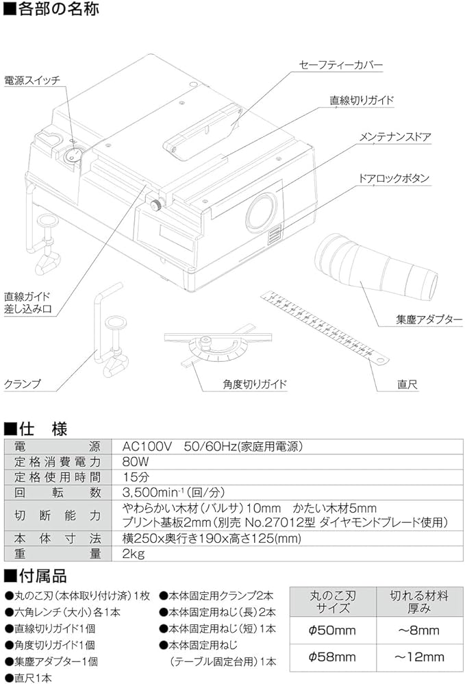 付属品:丸鋸刃荒目58mm・本体固定クランプ2個・直線ガイド・角度ガイド