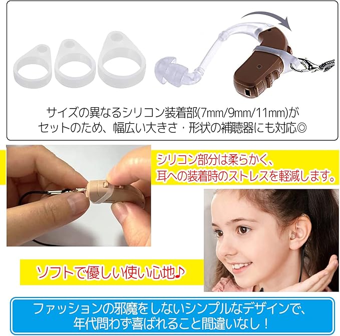 サイズの異なるシリコン装着部(7mm、9mm、11mm)がセットのため、幅広い大きさ・形状の補聴器にも対応◎シリコン部分は柔らかく、耳への装着時のストレスを軽減します。ソフトで優しい使い心地♪ファッションの邪魔をしないシンプルなデザインで、年代問わず喜ばれること間違いなし!