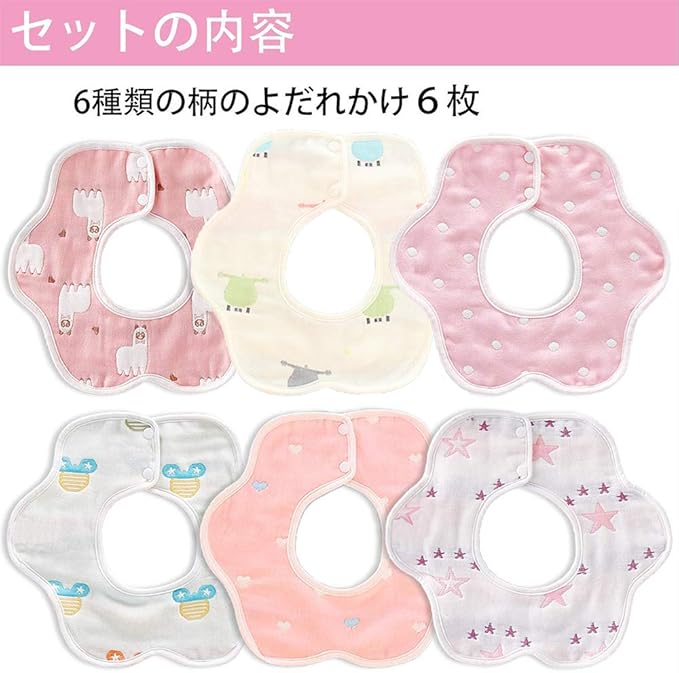 【よだれかけ】※ 花びら型 サイズ:25cm*27cm、ネックの幅:9cm。素材:6重綿、綿100% ご安心使用ください。吸水性、通気性が抜群 スタイ ビブ フラントは吸収性に優れたソフトコットン100%素材を使用 赤ちゃんをちゃんと守ります。よだれをキャッチ、赤ちゃんの服をきれいに保つために作ります。ファッションのデザインで、出かける時使っても全然大丈夫です。豊かな柄、可愛いデザインを盛り込んだ6枚セット、ご自身用にも、出産お祝いのギフトにもおすすめです。※ U形 サイズ:22cm*32cm、ネックの幅:9cm。 素材:6重綿、綿100% ご安心使用ください。吸水性、通気性が抜群 スタイ ビブ フラントは吸収性に優れたソフトコットン100%素材を使用 赤ちゃんをちゃんと守ります。よだれをキャッチ、赤ちゃんの服をきれいに保つために作ります。ファッションのデザインで、出かける時使っても全然大丈夫です。豊かな柄、可愛いデザインを盛り込んだ4枚セット、ご自身用にも、出産お祝いのギフトにもおすすめです。