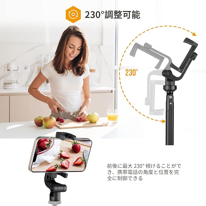 【前後230 調整、俯瞰も可能】このスマホマウントは、前後約230 まで調整可能です。また、スマホ三脚やセルフィースティックなどを利用した場合には、ボールヘッドや雲台などのアクセサリーを必要とせずに、俯瞰撮影やローアングル撮影が容易に実現できます。
