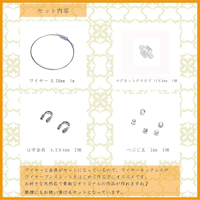 ワイヤーと金具がセットになっているので、ワイヤーネックレスやワイヤーブレスレットを作る方にオススメのキットとなっています。