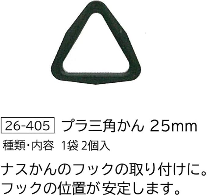 ナスかんのフックの取り付けに。アウトドアバッグに最適!軽くて丈夫な樹脂製パーツです。ナスかんと共に使用するとナスかんのフック位置が三角かんの頂点部で保持できます。小型リュックサックの肩ベルトなど三方向に分岐するベルトの取り付けにも。