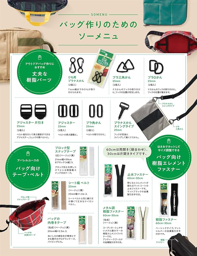 機能的なカジュアルバッグのソーイングに最適なパーツ。