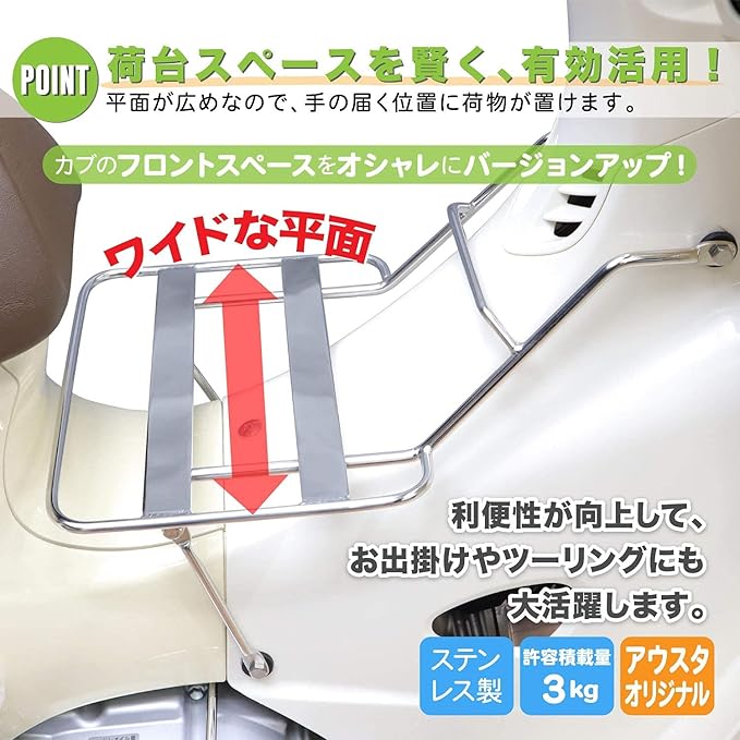 材質 ステンレス製 許容積載量 3.0 kg 備考 現行型スーパーカブ(JA45/JA44/JA42/AA09/AA07/AA06/JA61)専用の弁当キャリアです。(その他のスーパーカブにはお使い頂けません)