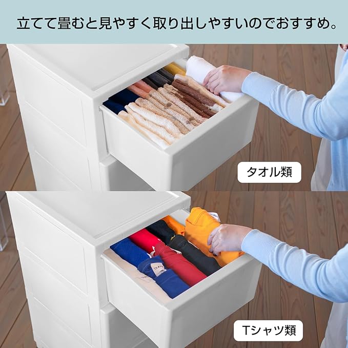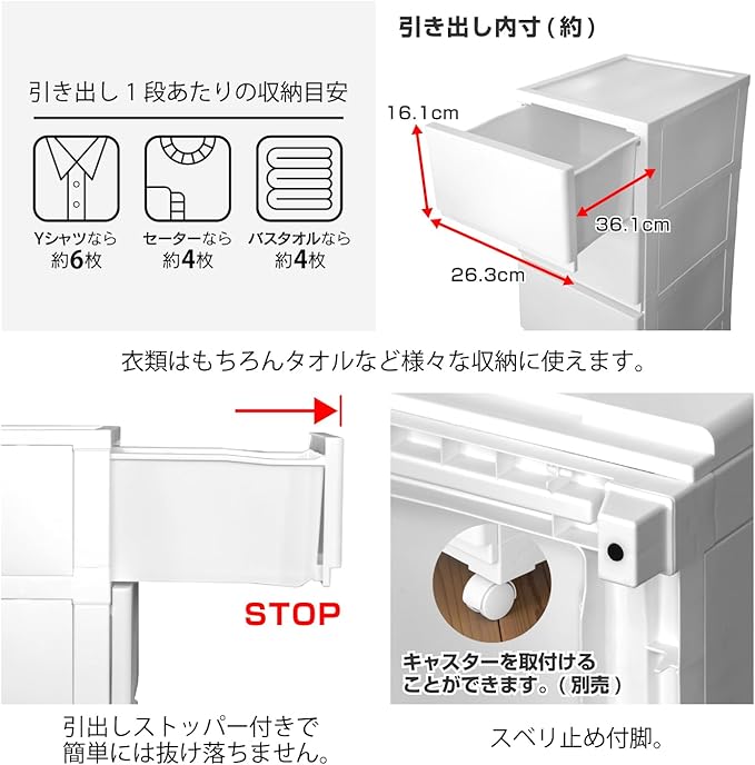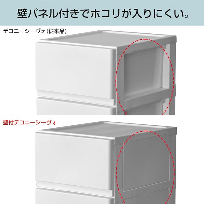 背面、側面にパネルが付いているので、引出し内にホコリが入りにくい仕様。簡単組み立て式の便利なプラスチック収納チェスト(工具不要)。インテリアになじむマットな質感とシックな色味。リビングはもちろん、クローゼットや押し入れ内の整理収納にも便利。