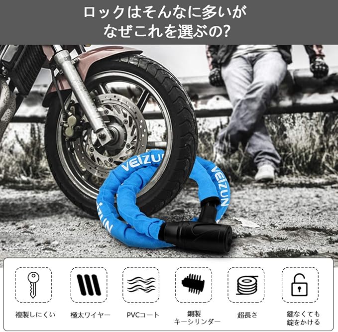 VEIZUN バイクロック チェーンロック ワイヤーロック バイク 自転車 スチールロック タイヤロック φ(直径)22mm 1200mm 盗難防止 多用途 頑丈 極太 極厚 ブルー