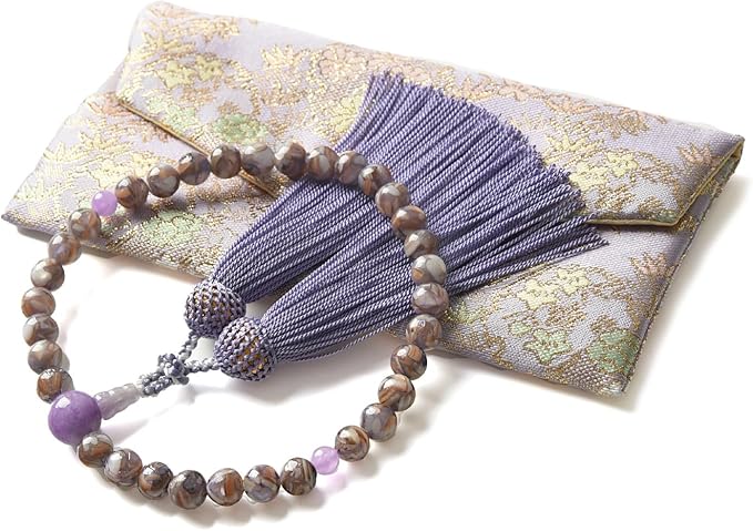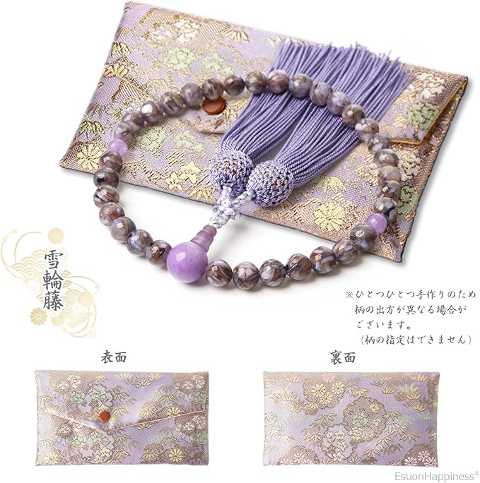 [EsuonHappiness] 数珠 女性用 西陣織金襴 数珠袋付き 天然石 紅水晶 印度翡翠 赤めのう オニキス 念珠 圧縮貝パール8mm [藤/藤雲石(雪輪藤)]